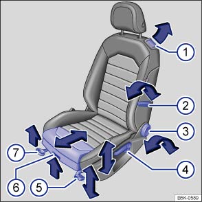 | ⑦ | Pushing the front seat forwards or backwards. | Lift the handle and move the front seat. The front seat must engage after the lever has been released. |