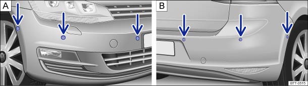 Fig. 148 ParkPilot ultrasound sensors around the vehicle, A: in the front bumper, B: in the rear bumper